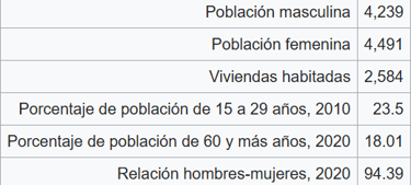 Es un municipio con 8,730 habitantes de acuerdo con los resultados del INEGI. Censo de Población y Vivienda 2020.